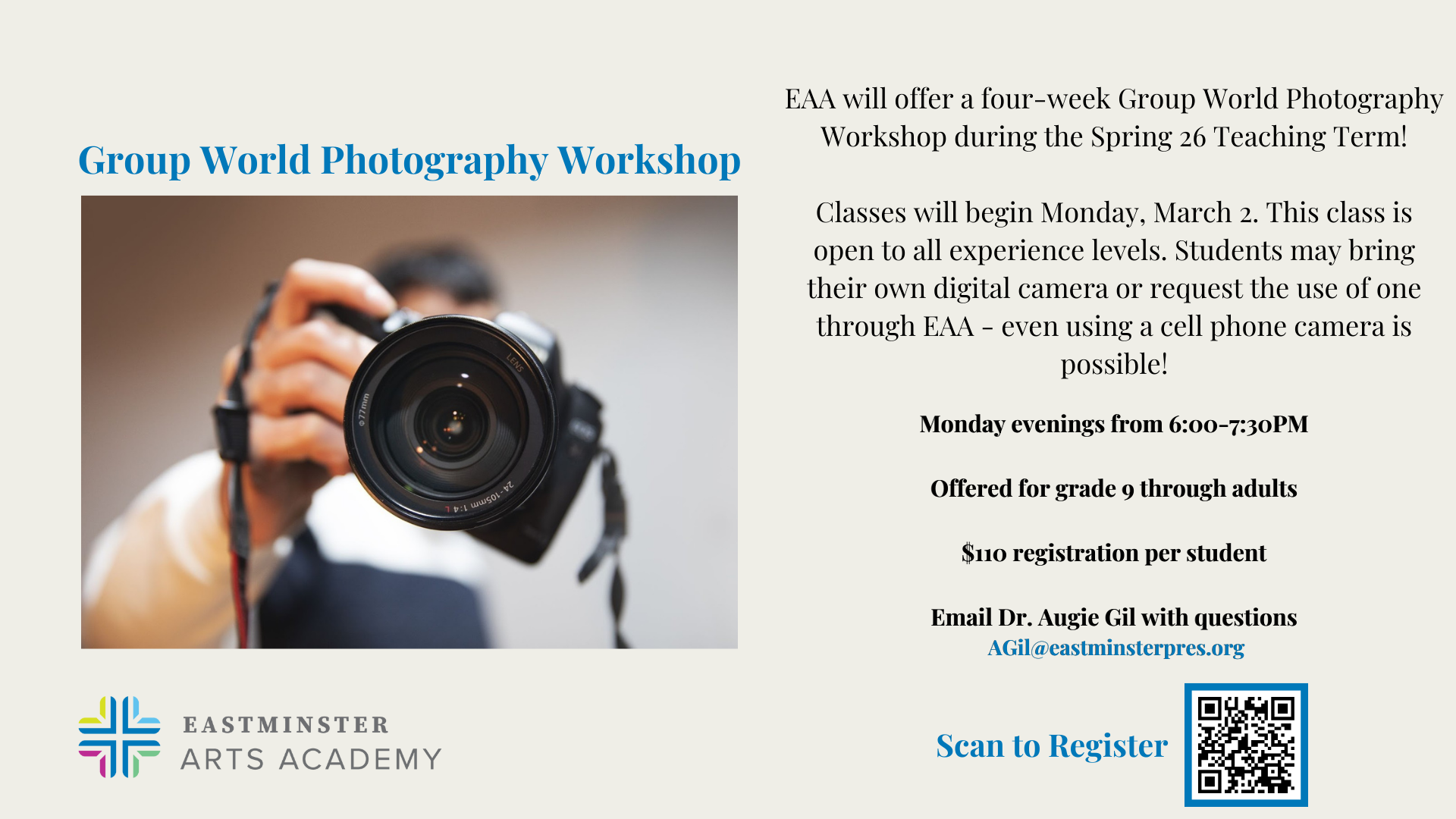 Register for the Eastminster Arts Academy Group Photography Workshop. This course meets the following dates: Monday, March 2, Monday, March 9, Monday, March 16, and Monday, March 23. Email Dr. Augie Gil (agil@eastminsterpres.org) with questions.