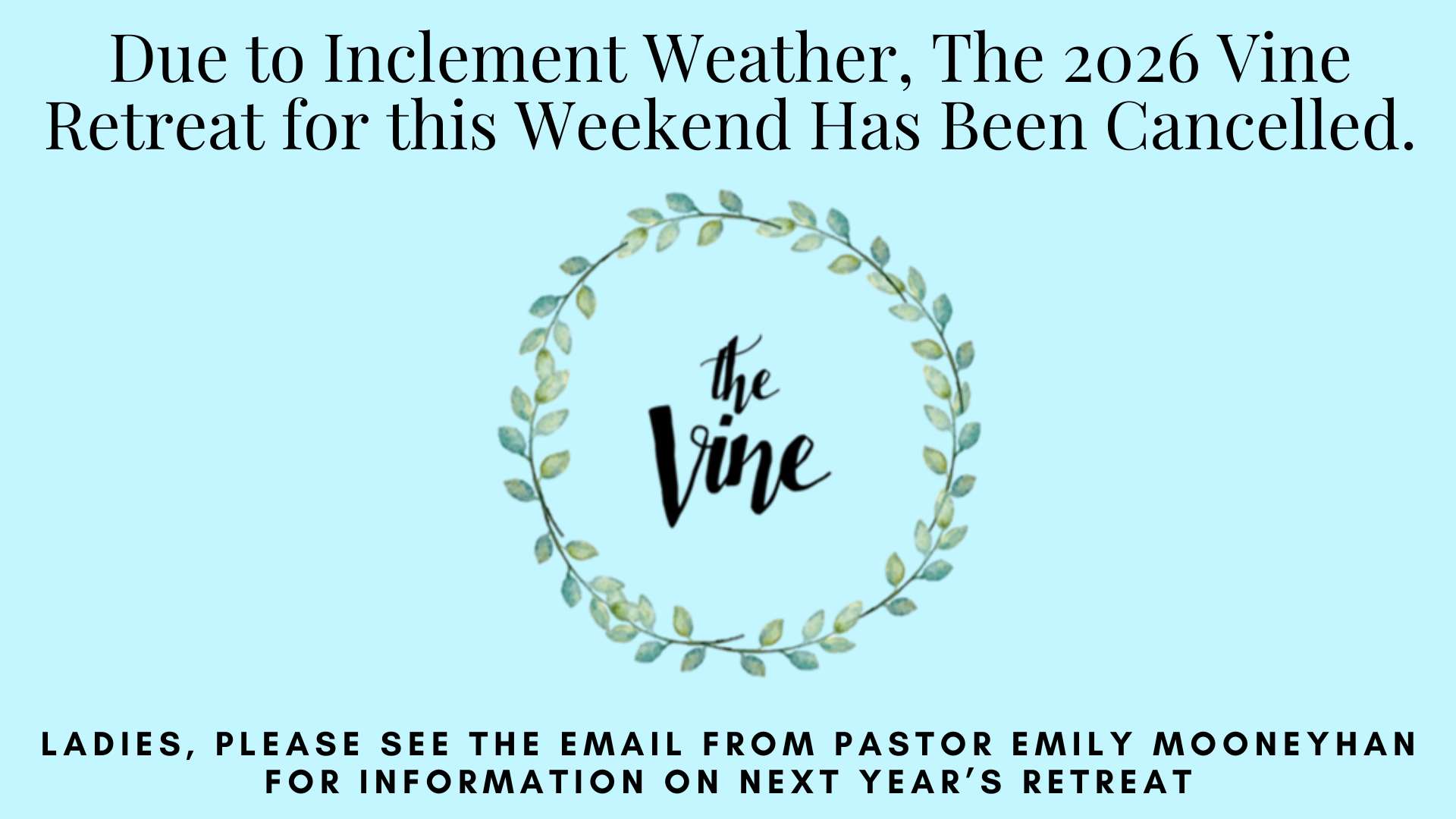 Details on the 2027 Vine Retreat will be available soon. If you have paid for the 2026 Vine and would like to transfer that amount to the 2027 retreat, or if you would prefer a refund, please contact the Church Office and ask to speak with Rev. Emily Mooneyhan.
