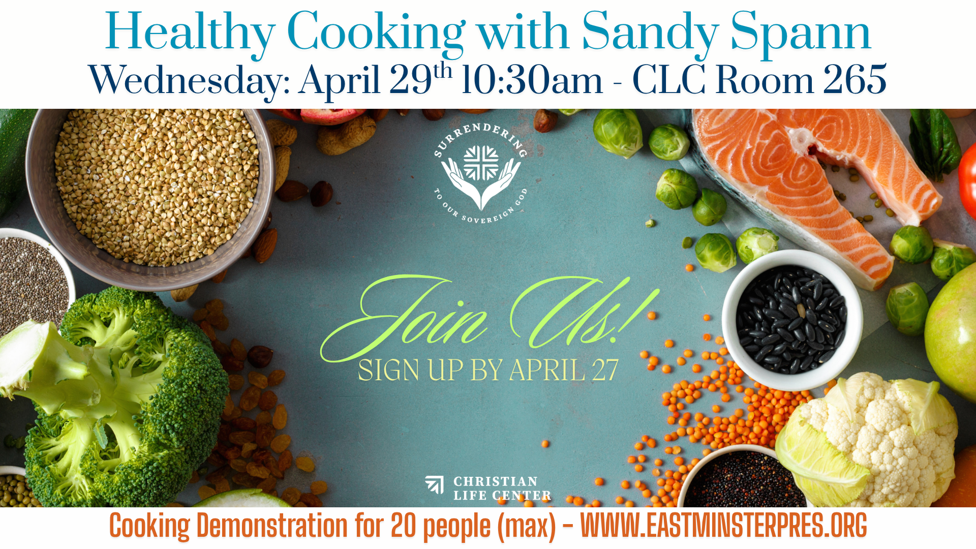 We’ll meet at 10:30 a.m. on the second floor of the CLC (Room 265) for fellowship, fun and to learn some easy, healthy recipes! AND there will be a tasting after the demonstration.