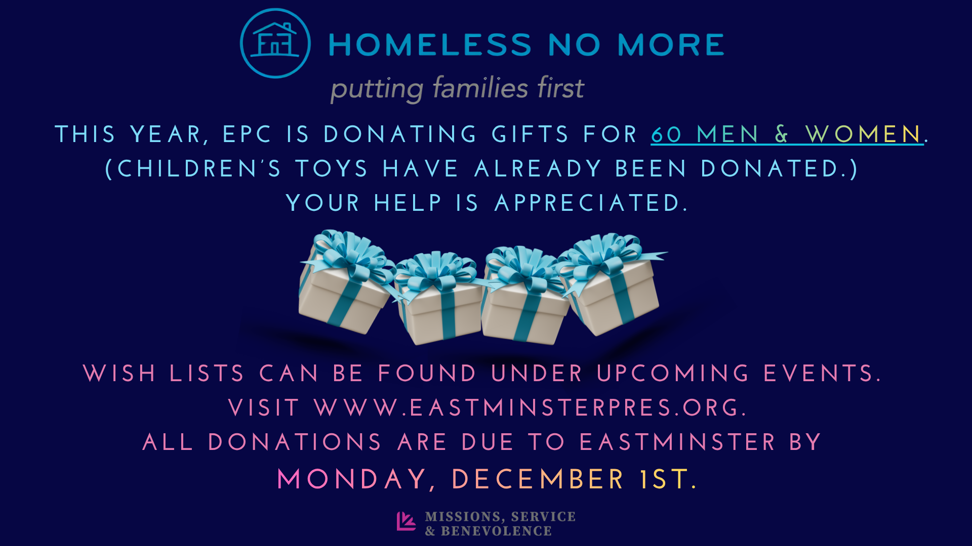 For over 25 years, the members of Eastminster have been providing toys, adult gifts, meals and household items for clients of Homeless No More. Your generosity is so appreciated by the staff of Homeless No More and the clients!
