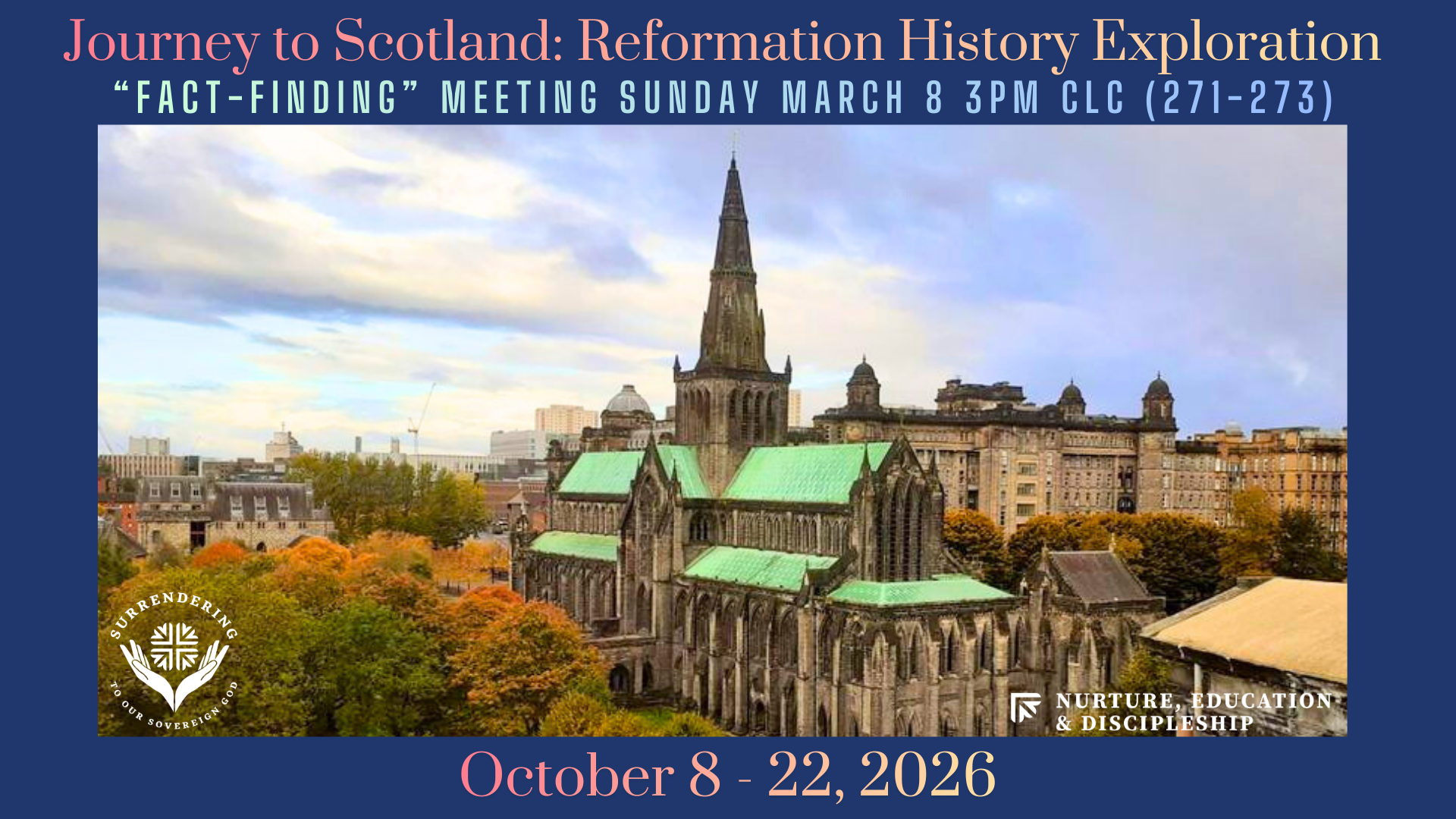 Back by popular demand, Eastminster is planning a trip to Scotland October 8-22, 2026, to explore the history of the Reformation in Scotland and the rise of what became the Presbyterian denomination. There will be a fact-finding meeting in Rooms 271-273 in the CLC on Sunday, March 8, at 3:00 pm to answer your questions about itinerary, travel, and registration.
