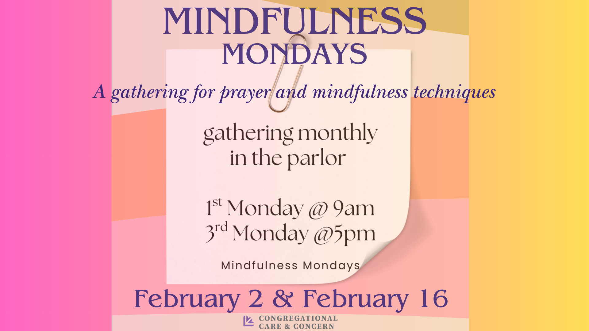 Mindfulness Mondays returns on February 16th at 5 p.m. in the parlor. Join Care Pastors for a time of centering prayer, mindfulness practices, and also to pray over our church family prayer list on the first Monday of the month at 9am and third Monday at 5pm.