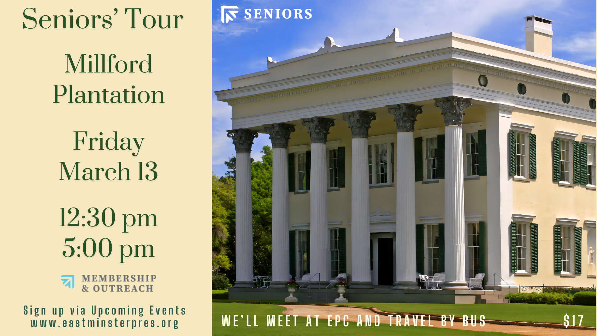 Attention Seniors! You are invited to a private tour of Historic Millford Plantation in Pinewood, SC, on Friday, March 13th. The cost is $17.00