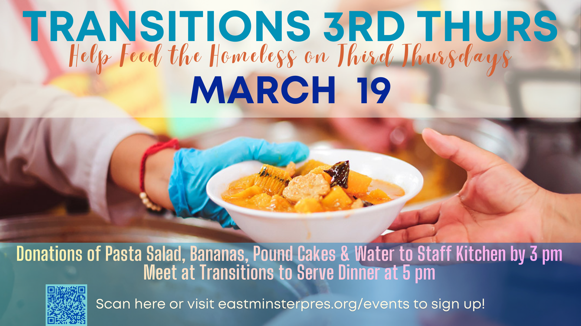 Volunteers are needed each third Thursday to serve at Transitions. Donations are appreciated each third Thursday and are due to the Church Office by 3.