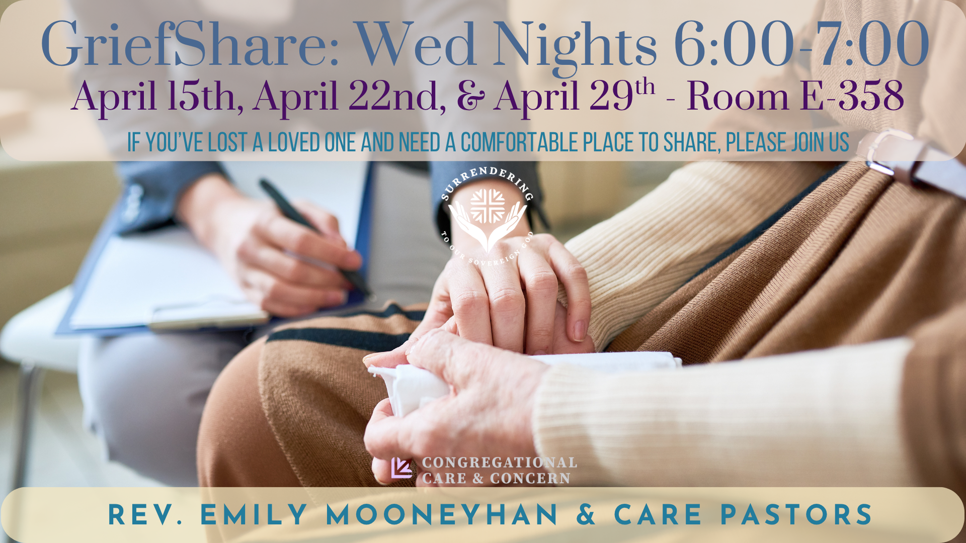 If you are struggling with grief and would find comfort in sharing with others or receiving pastoral guidance, consider joining our conversations in April. We will meet after dinner at 6 p.m. on April 15th, 22nd & 29th in the Education Building, Room 358, at the end of the hall.