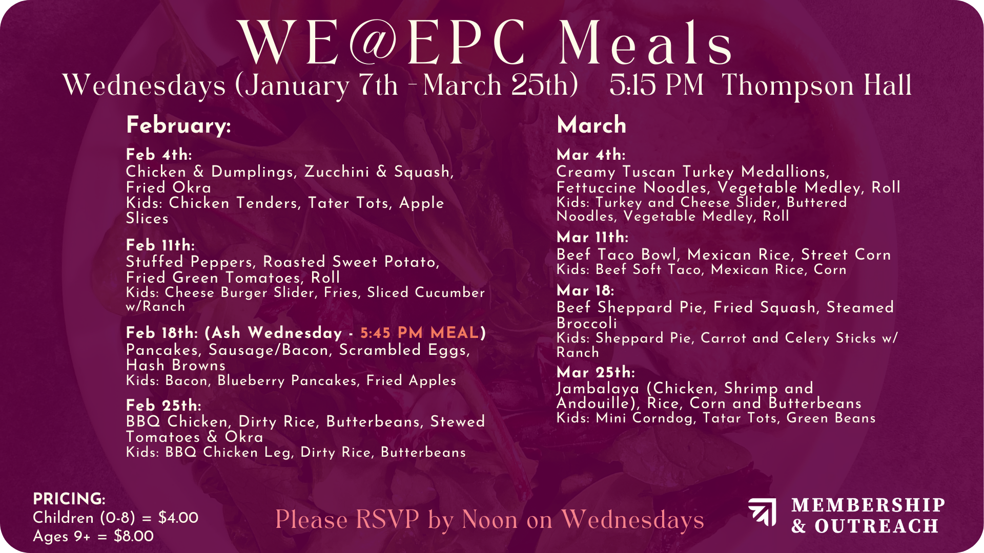 Join us in Thompson Hall for fellowship and a delicious meal before Adult evening classes this Winter.