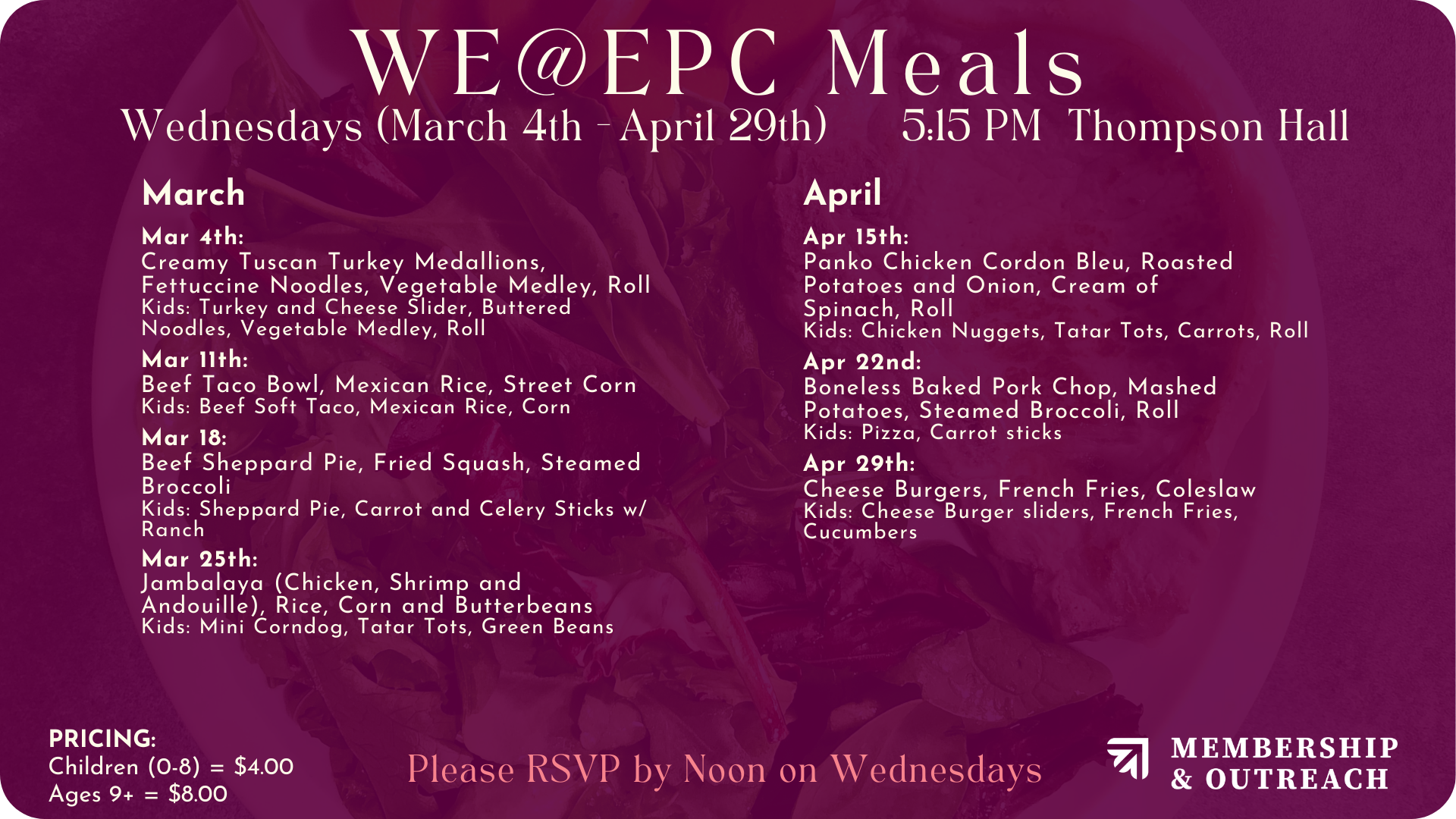 Our meals go through March 25th, and then we have a two-week break. This Spring, we will have three additional meals in April: 4/15, 4/22 & 4/29.