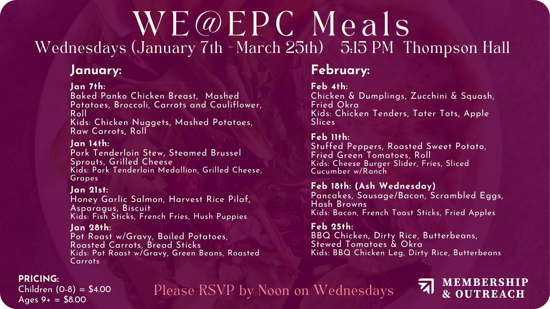 Please RSVP (by Wed at noon) at the button below. You must RSVP each Wednesday so we have an accurate count for the meal.